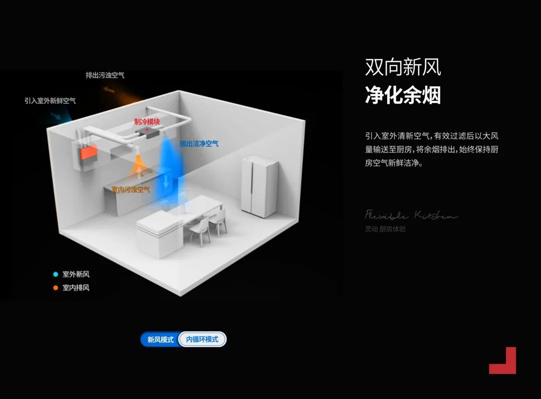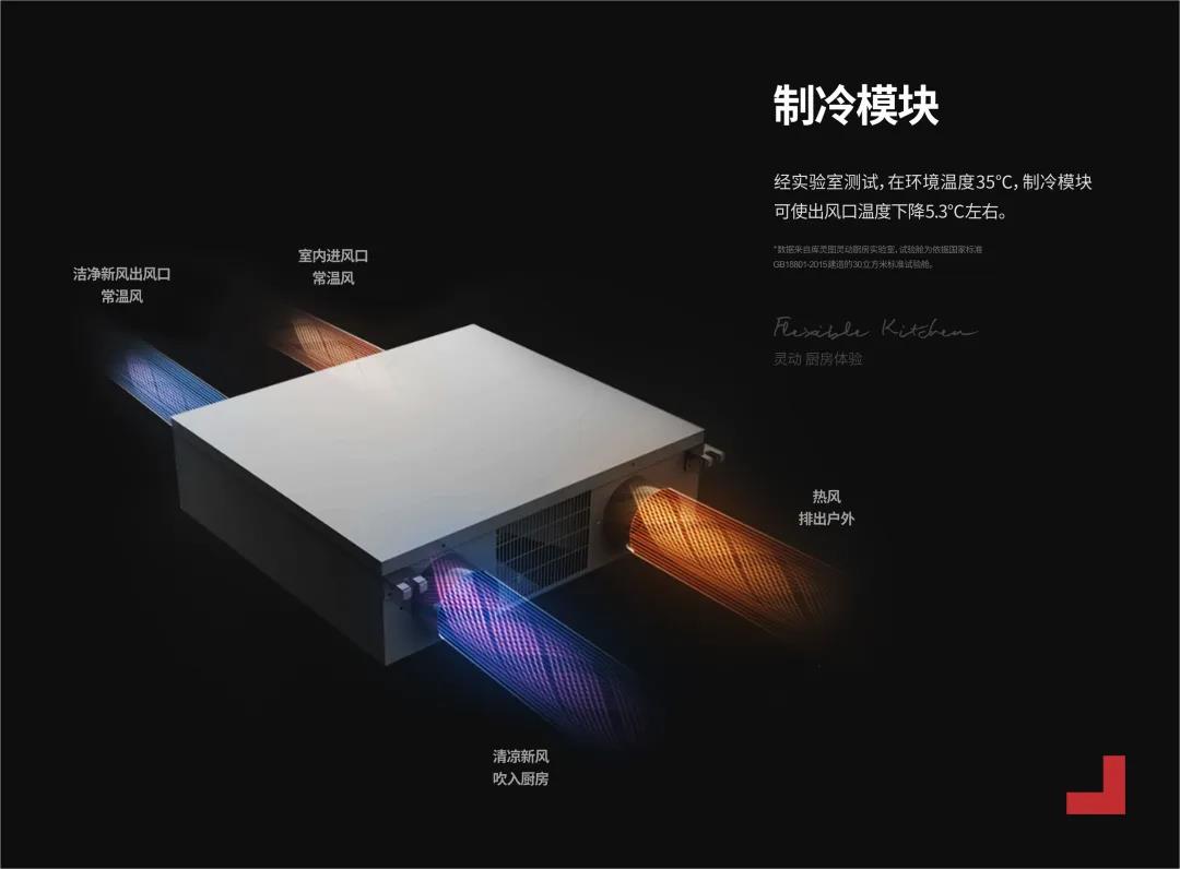 針對提升中國廚房的環(huán)境與烹飪體驗,庫靈圖研發(fā)廚房新風系統(tǒng)與制冷模塊,集成新風、凈味、降溫的功能,進一步改善中國廚房的烹飪體驗。