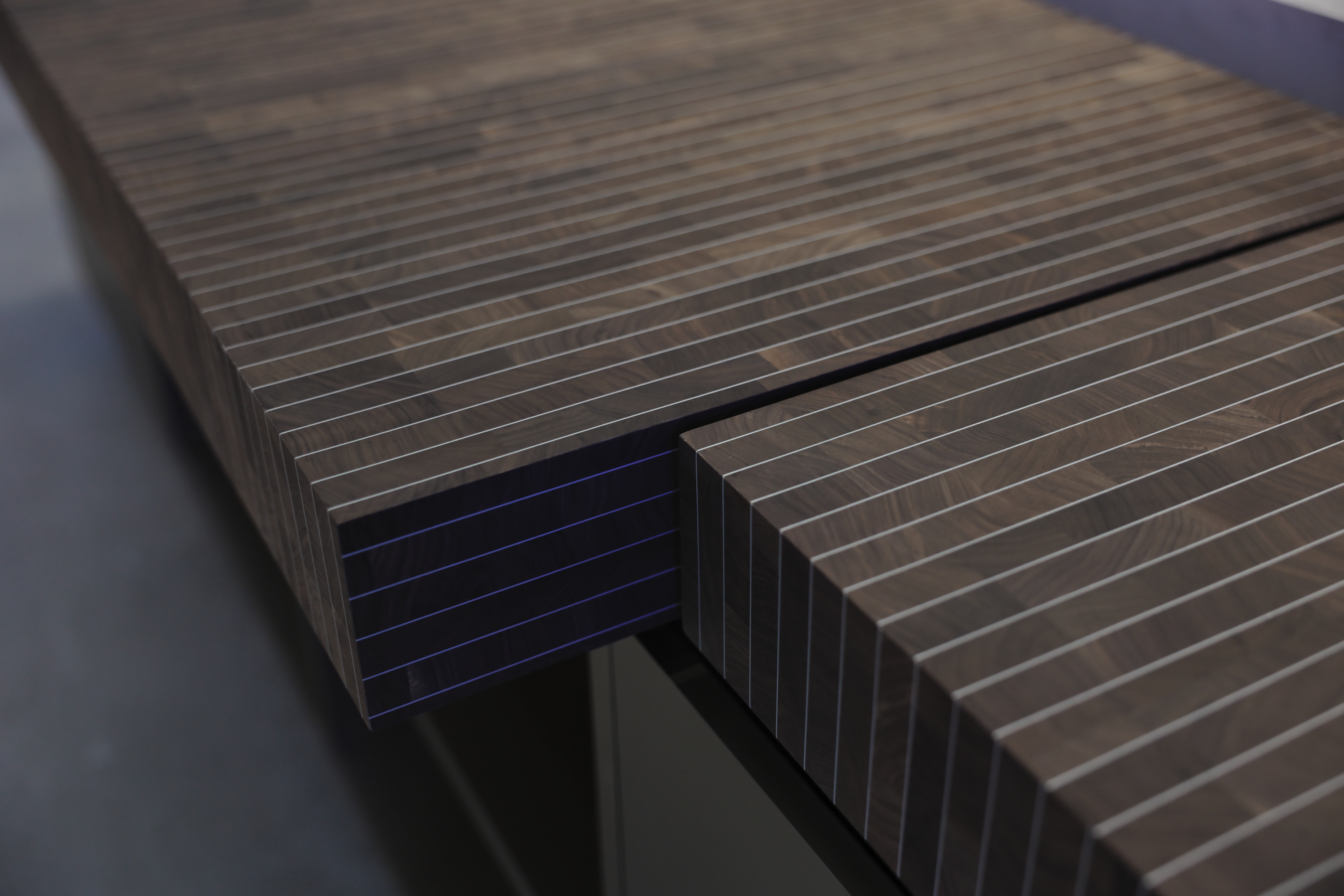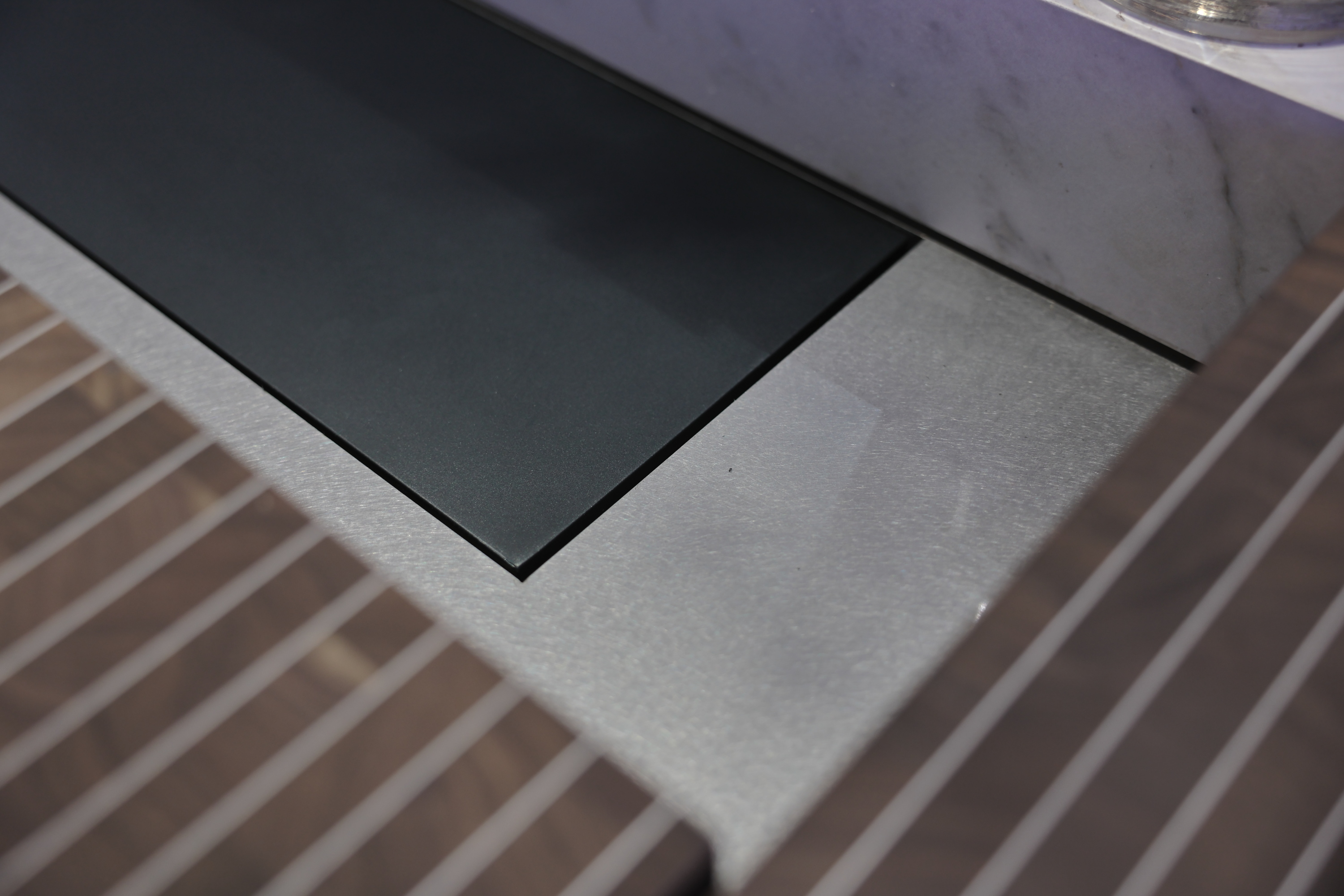 “庫左”1.0 系列社交島臺,從人體工學及動線規劃出發,將烹飪區、操作區、清洗區與用餐區集成在島臺上,不銹鋼材質與銀線胡桃木的結合,詮釋著典雅浪漫的生活,智能電動伸縮臺面,使得開放的流動空間充滿自由無窮的想象力。