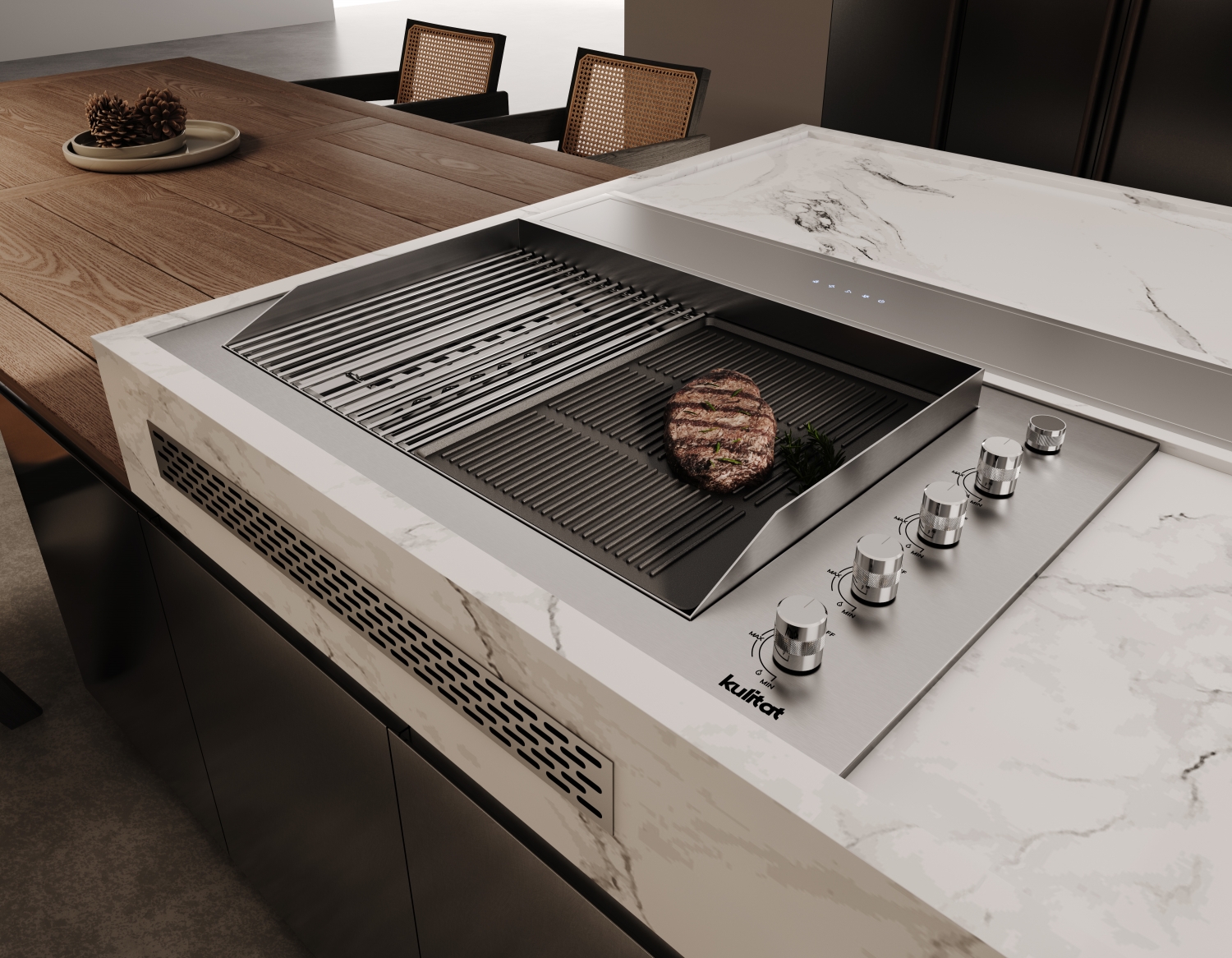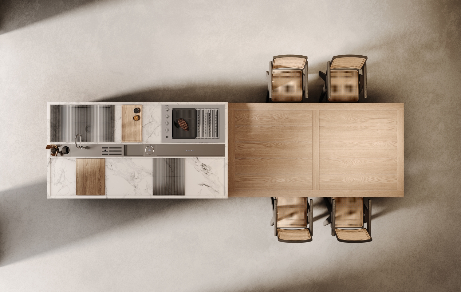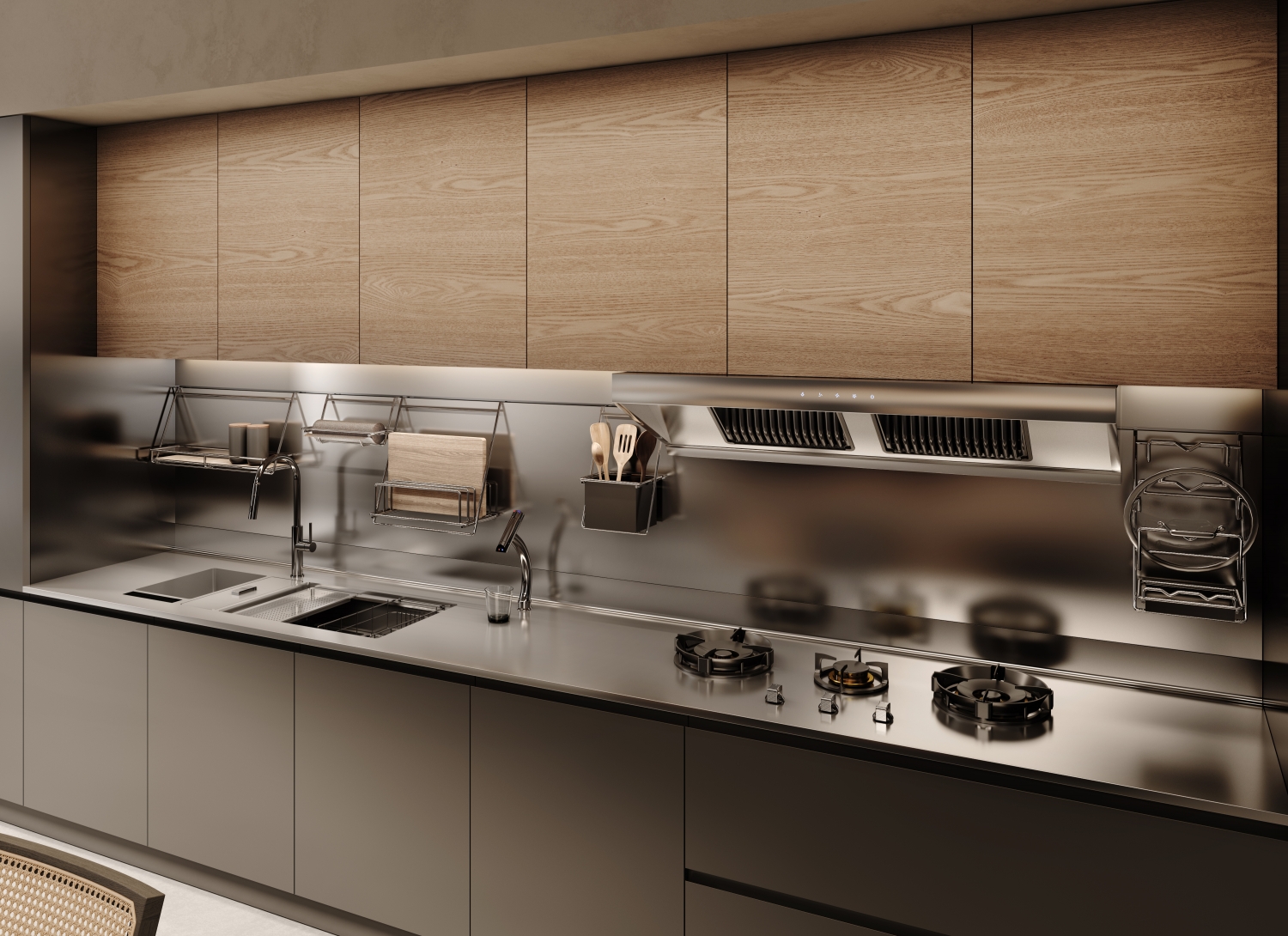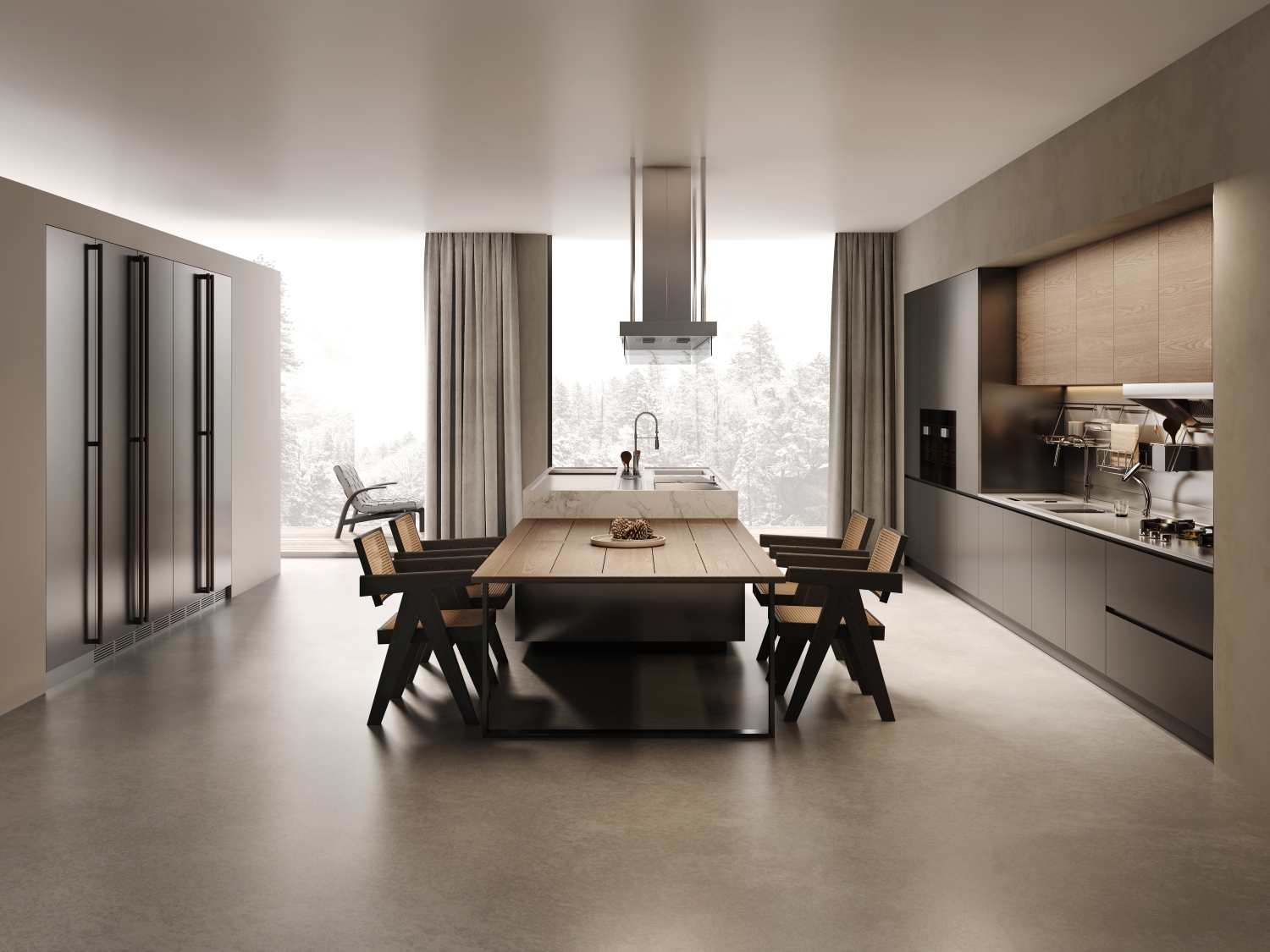 Clowzer「克洛茲」 追尋去繁就簡(jiǎn)卻不失有序規(guī)整的設(shè)計(jì)旋律,承載家庭的溫情紐帶。餐廚一體化的簡(jiǎn)潔空間實(shí)現(xiàn)了廚房的實(shí)用性與設(shè)計(jì)藝術(shù)性的平衡,恰到好處的低調(diào)與高級(jí),傾注著鋼材、石材、木材的多重碰撞而帶來的無限可能。
